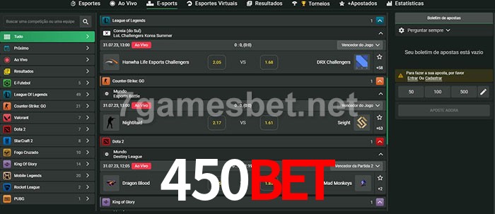 O 450Bet oferece uma grande seleção de opções de apostas em e-sports com probabilidades competitivas